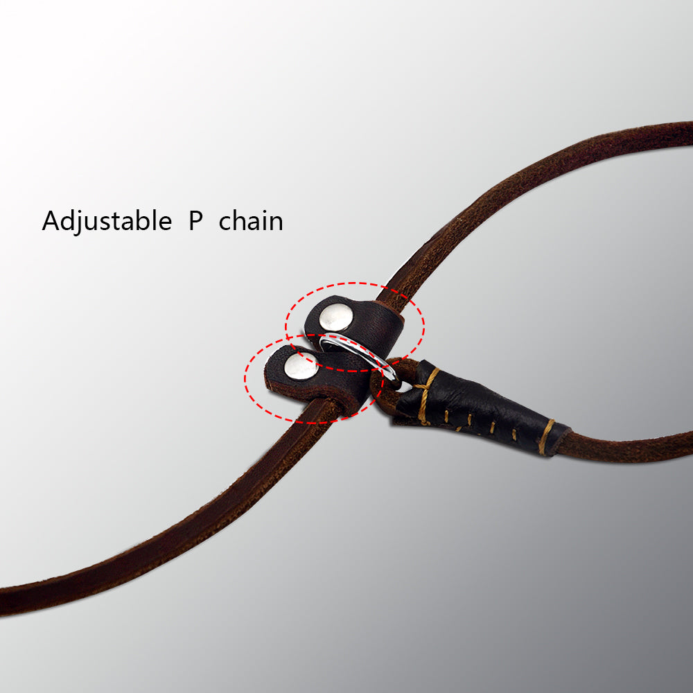 This genuine leather slip leash has 2 leather riveted sliders that adjusts the collar loop freely to fit any neck size and prevents slipping off. This P-leash serves as both a collar and leash by tightening and loosening when necessary.