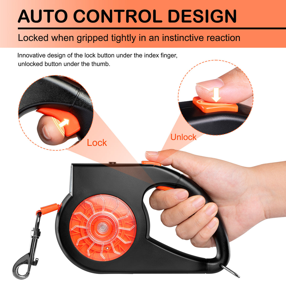 For a retractable leash, the most important part is the lock mechanism. After research, we found that many people cannot press the lock button to stop their dog in a timely manner, when the dog suddenly charged fiercely while walking. So, we design the lock button just under the index finger, that, you just need to grab tightly, not even press the button, that you can lock the leash to stop your dogs. A very easy way, a auto way to lock it.